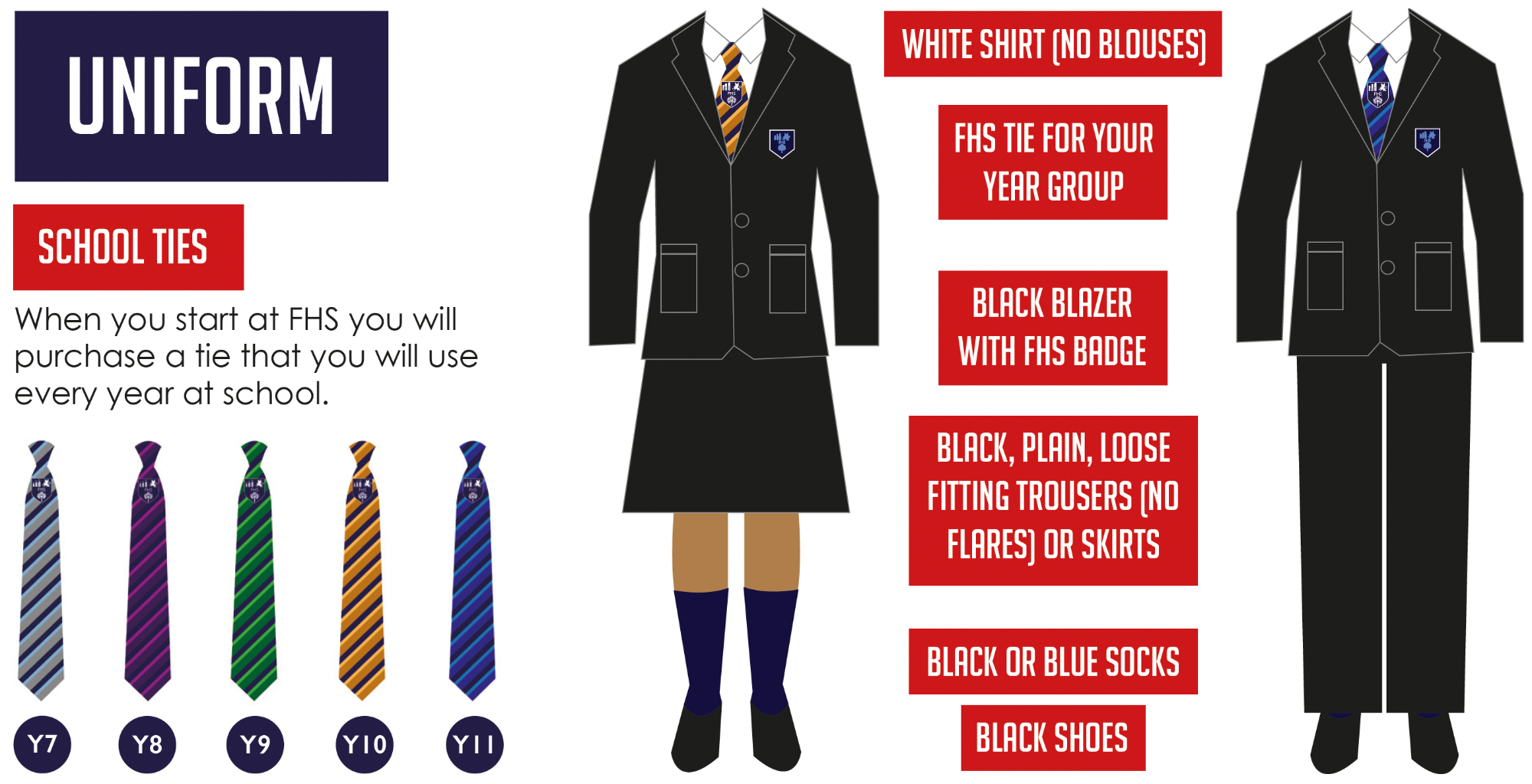 - A traditional black blazer (this can be bought from any retailer), which must have the FHS badge on the pocket (available from our uniform suppliers below).